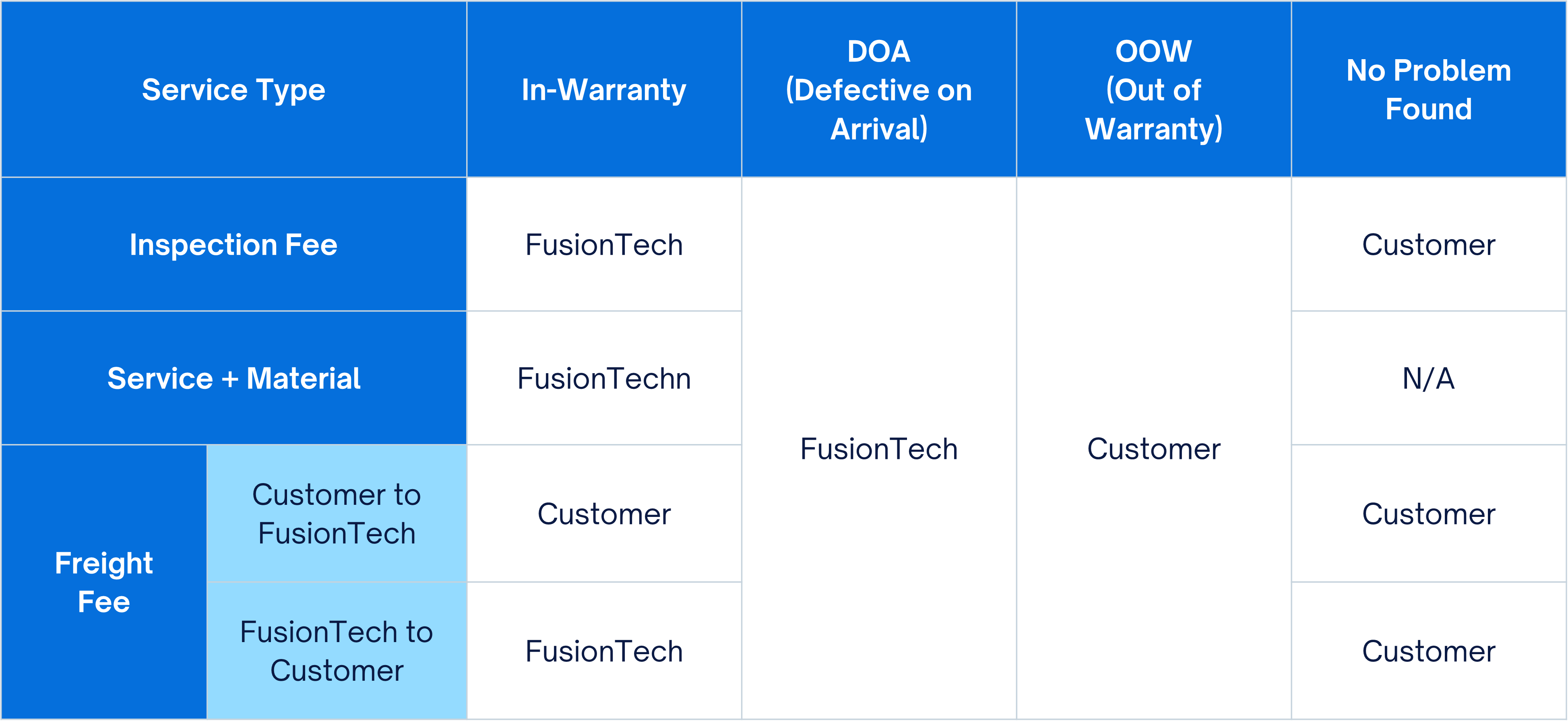 - DOA is dealt with the highest priority and should be reported to FusionTech immediately.